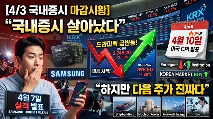 특히 다음 주는 그냥 지나갈 한 주가 아닙니다. 4월 7일 삼성전자 잠정실적이 시장 기대를 확인시켜 줄지 봐야 하고, 4월 10일 금요일 미국 CPI 발표는 다시 한 번 글로벌 증시를 크게 흔들 수 있습니다. 지금은 반등에 취해 추격할 때가 아니라, 시장이 무엇을 먼저 반영하고 있는지 차분히 읽어야 할 구간입니다.