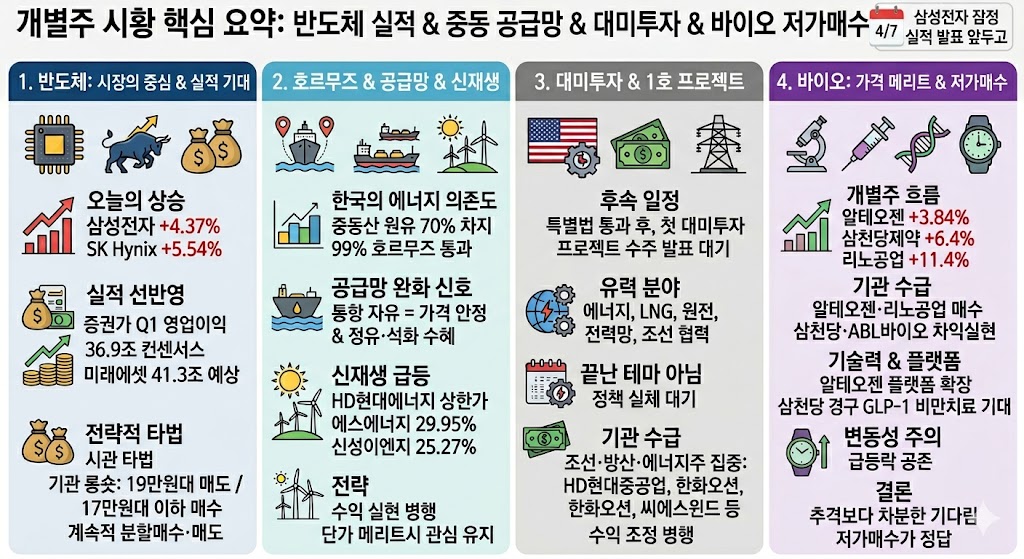 오늘 국내증시는 분명 잘 버텼고, 꽤 괜찮게 올랐습니다. 외국인도 돌아왔고, 기관도 방향이 보이는 자리에 다시 돈을 넣었습니다. 반도체는 삼성전자 실적 기대를 안고 움직였고, 호르무즈 통항 완화 기대는 한국처럼 수입에 의존하는 경제에 확실한 안도감을 줬습니다.