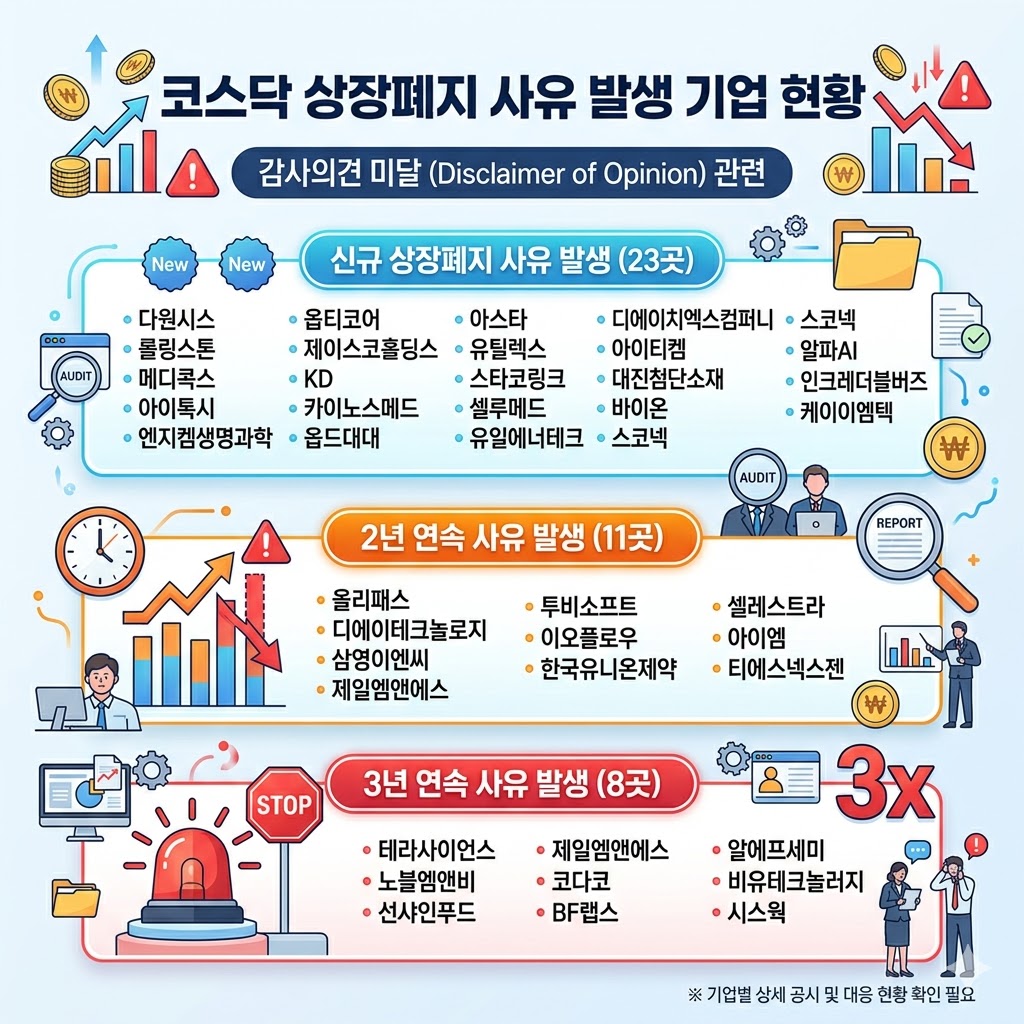 더 큰 충격은 코스닥에서 나왔습니다. 코스닥 시장에서는 총 42개사가 감사의견 미달로 상장폐지 사유가 발생한 것으로 집계됐습니다. 세부적으로 보면 신규 23곳, 2년 연속 11곳, 3년 연속 8곳으로 나뉘는데, 숫자만 봐도 이번 감사보고서 시즌의 리스크가 얼마나 컸는지 바로 느껴집니다.