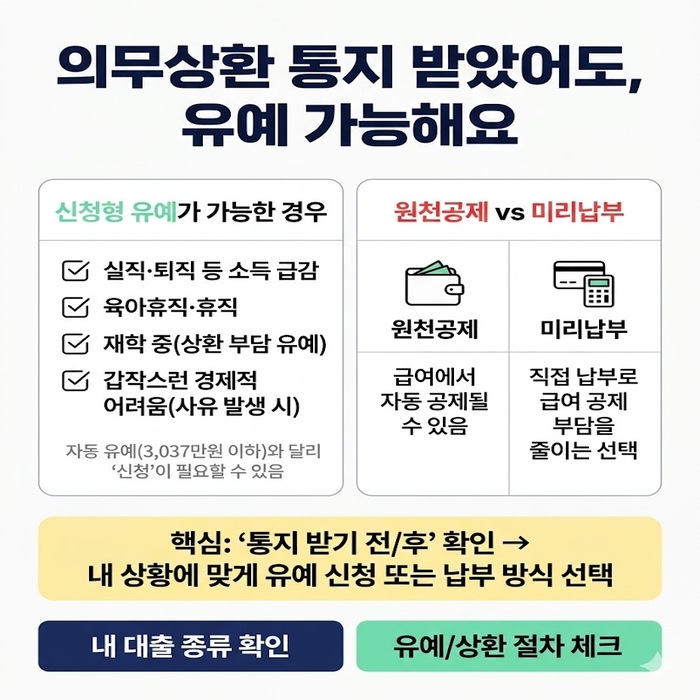 - 실직·육아휴직·재학 등 사유가 있으면 신청형 유예 가능 여부 즉시 확인