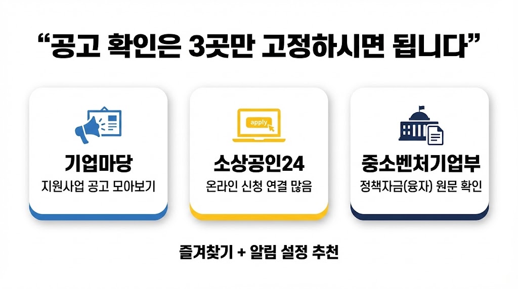 3) 공고는 3곳(기업마당·소상공인24·중기부)만 고정하시면 됩니다.