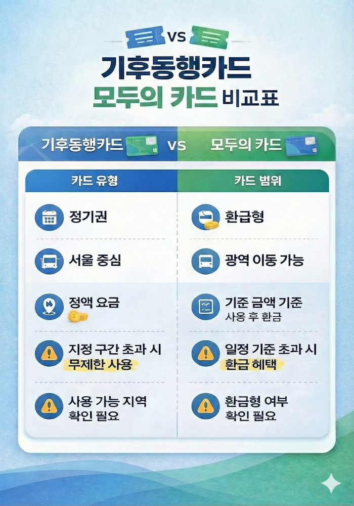 모두의 카드 vs 기후동행카드(2026 최신)|월 6만 원대 ‘정액/환급’ 진짜 이득인 사람은?