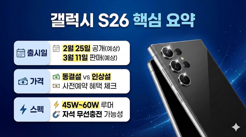 커뮤니티마다 말이 달라서 더 헷갈리는데, 오늘은 갤럭시 S26(갤럭신 S26로도 많이 검색) 루머/보도들을 기준으로 출시일·가격·스펙 핵심만 ‘한 번에’ 정리해볼게.