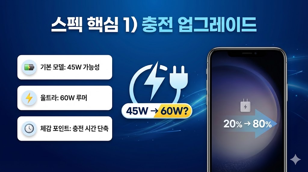 이번 갤럭시 S26 루머 중 체감 1순위는 충전이야. 기본 모델도 상향 가능성이 거론되고, 울트라는 60W 얘기가 계속 나와.