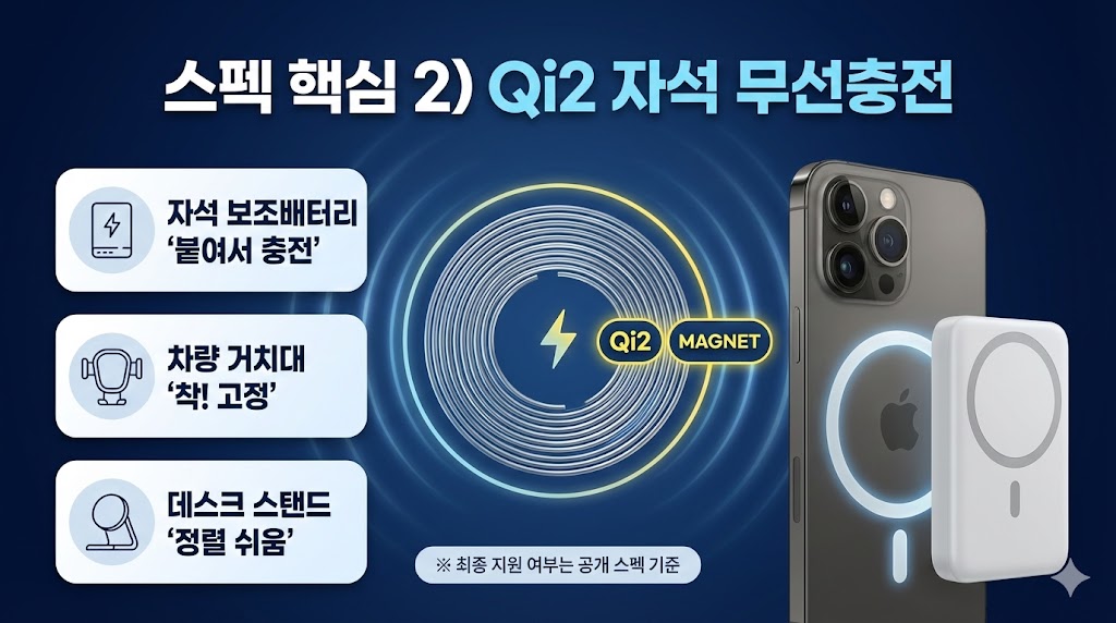 스펙 핵심 2) Qi2 자석 무선충전(‘붙는’ 생태계)