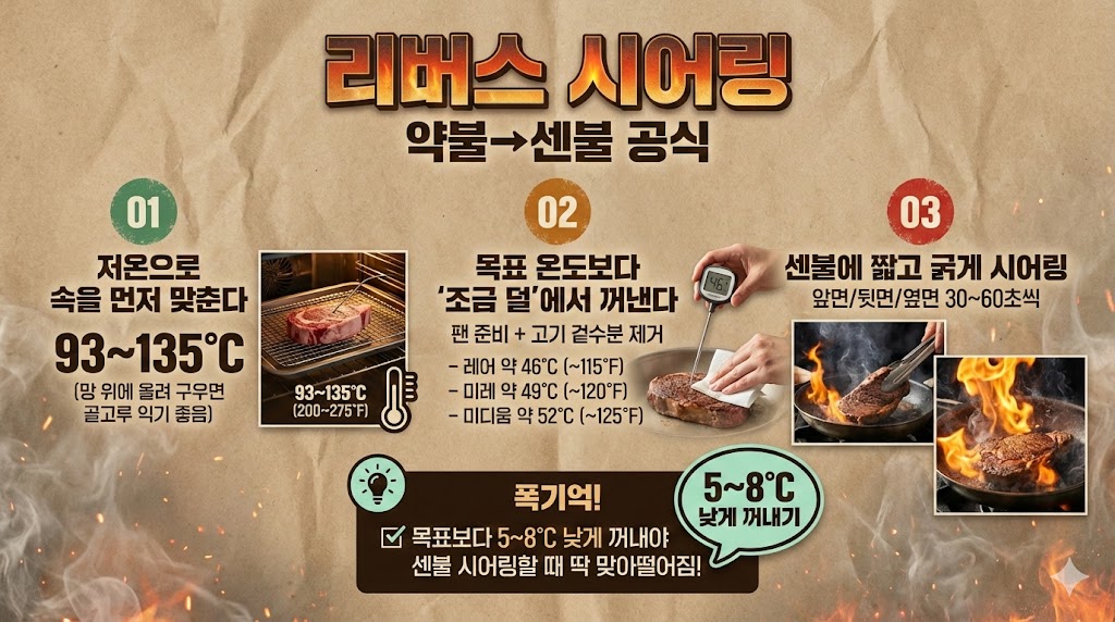 그리고 그걸 가장 쉽게 해주는 방식이 요즘 고수들이 자주 쓰는 리버스 시어링(약불→센불)이에요. 아래 순서대로만 하면 “겉바속촉”이 거의 고정값으로 나옵니다.